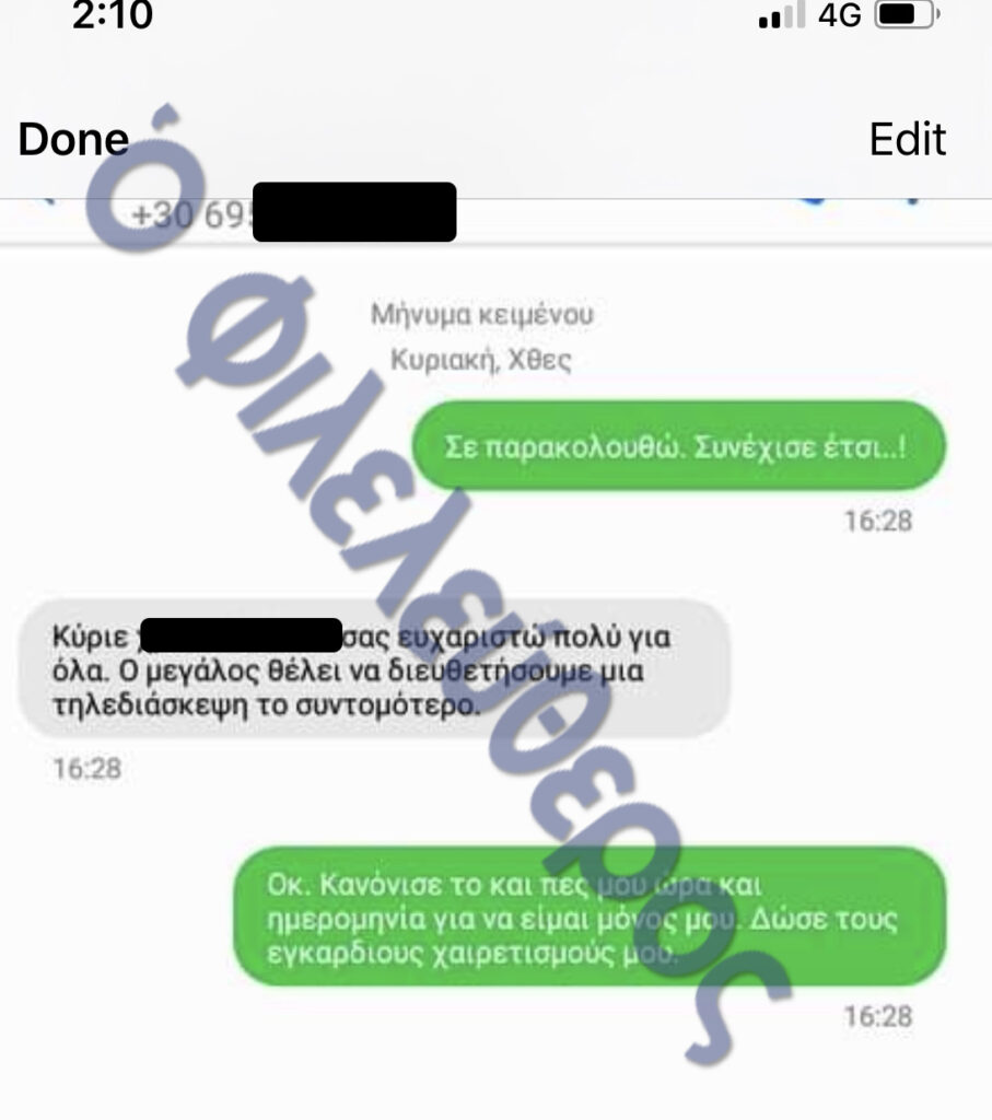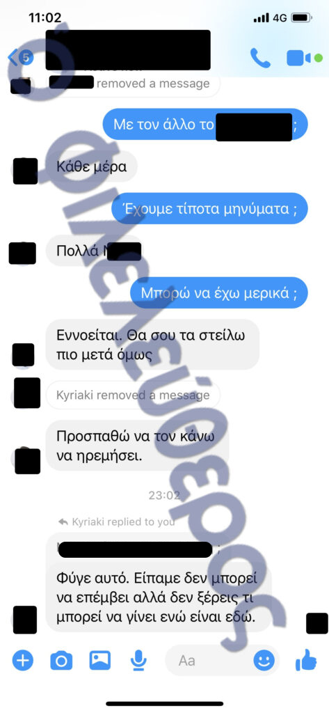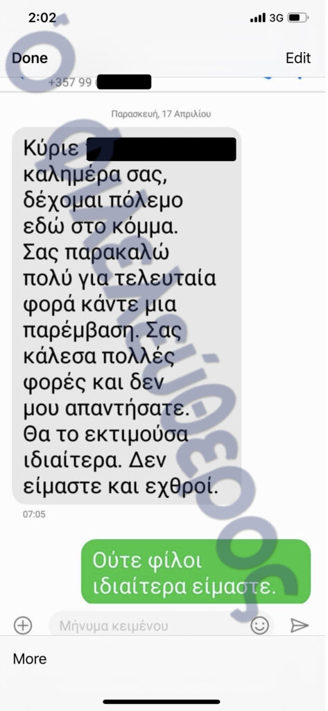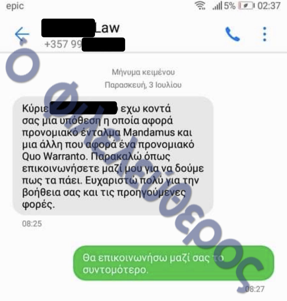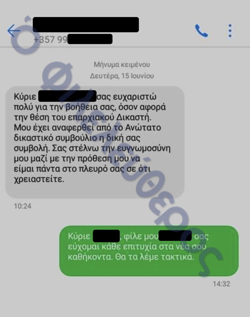 Üst düzey bir yargı yetkilisi, hukuk ve yürütme çevrelerindeki yetkililerle iletişim halinde görünüyor. Bir parti yetkilisi, iç bir anlaşmazlığa müdahale etmesi için yargıca (M. Christodoulou) şu mesajı yazıyor: "Lütfen son bir kez müdahale edin. Sizi defalarca aradım ama cevap vermediniz. Çok memnun olurum. Biz düşman değiliz." Yargıcın yanıtı ise şöyle: "Özellikle dost da değiliz."